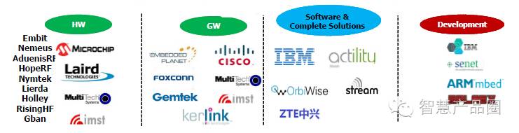 LoRa的產業鏈中(包括終端硬件產商、芯片產商、模塊網關產商、軟件廠商、系統集成商、網絡運營商)的每一環均有大量的企業,構成了LoRa的完整生態系統,促使了LoRa的快速發展與生態繁盛。