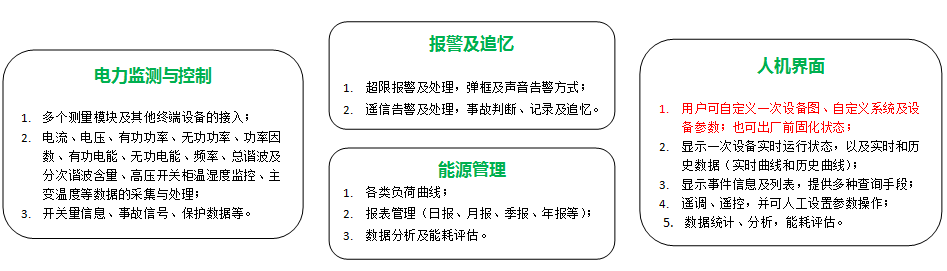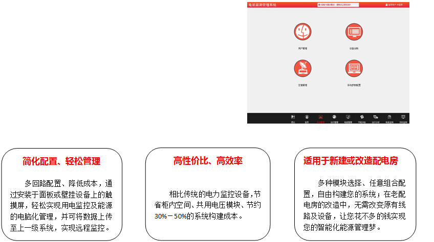 將各類模塊的信息,通過RS485線集中到管理系統,輕松實現用電監控及能源管理,為您提供節能降耗的有效解決方案,并可將數據上傳至上一級管理系統。安裝方式:可嵌入在面板門上集中顯示,適用于新站或老站改造;可壁掛式固定在配電房或值班室內,自帶打印、UPS不間斷電源,適用于老站改造。