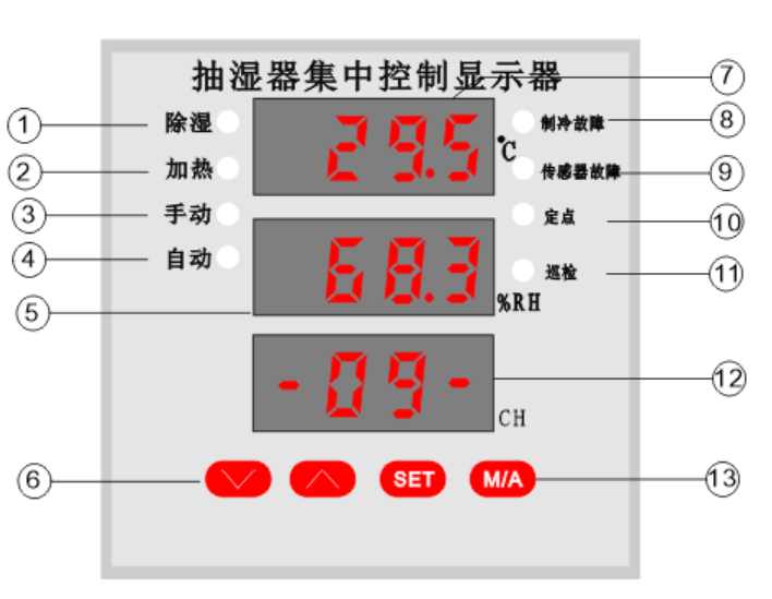 LRJ194K-7000LX 數顯溫濕度顯示,工作電壓AC220V,帶485通訊,集中顯示除濕器數量1-24臺,濕度設置范圍30%-75%。 面板安裝 開孔68*68,塑殼,面板安裝,帶485通訊,主機和傳感器連接線6米(最多可一拖24臺)